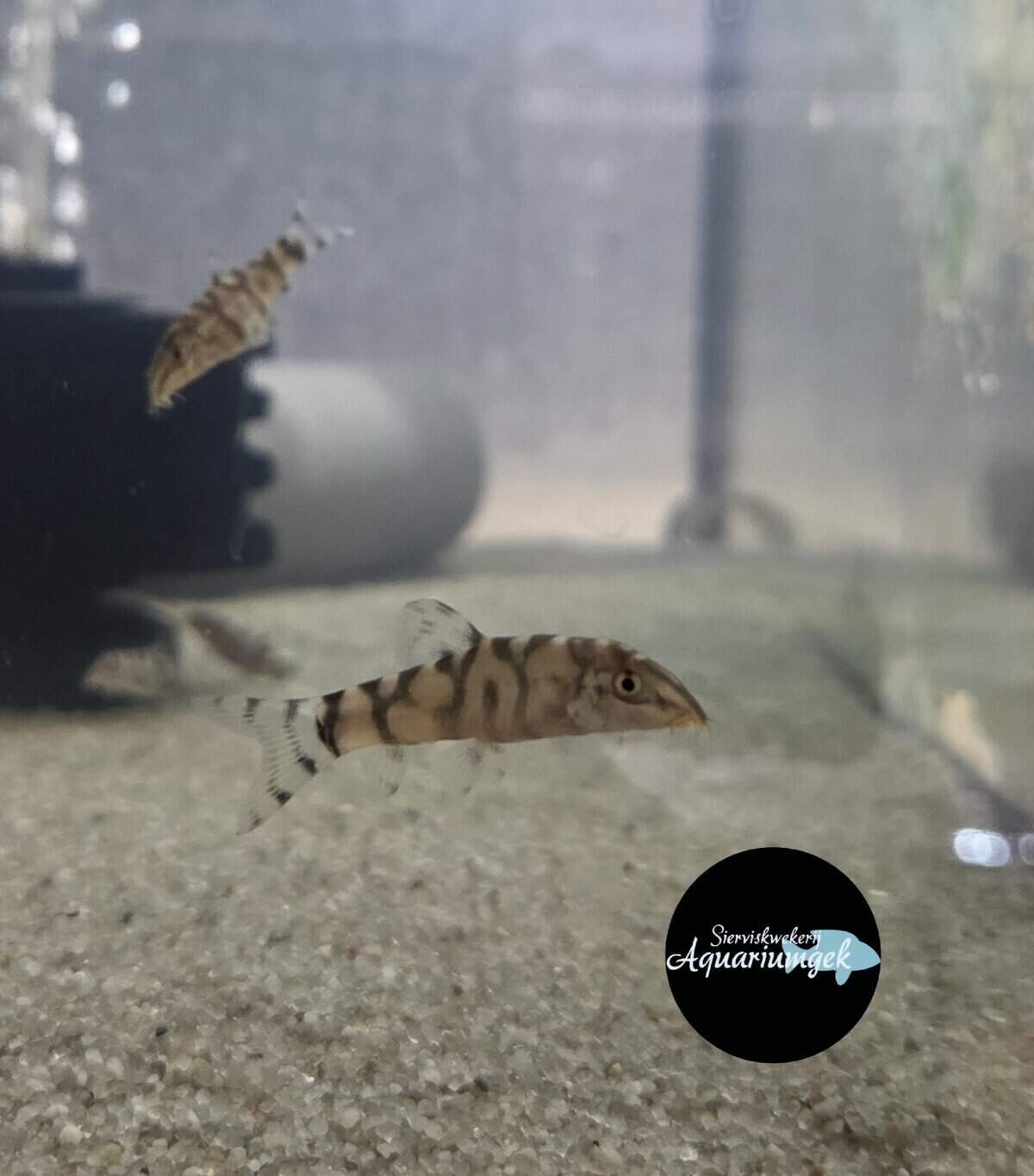 Inrichting aquarium: Filterzand. Kienhout, steen en planten kunnen worden gebruikt
